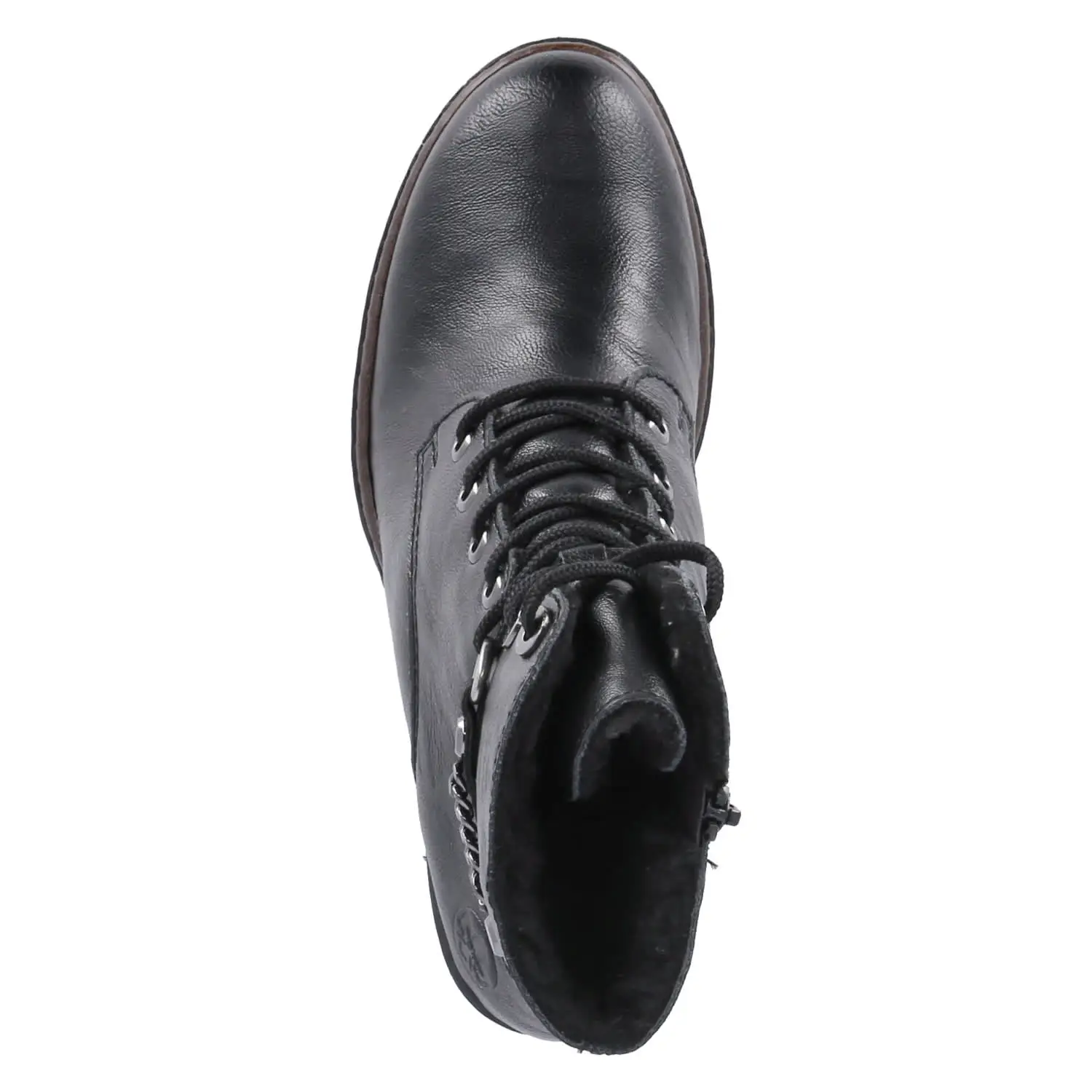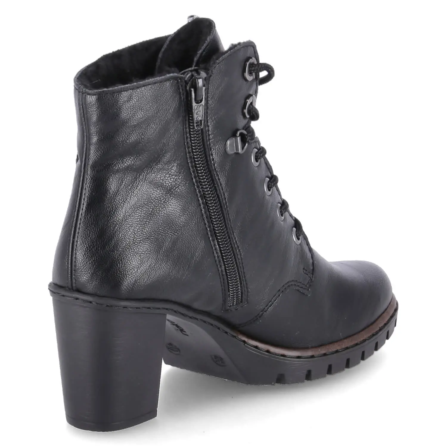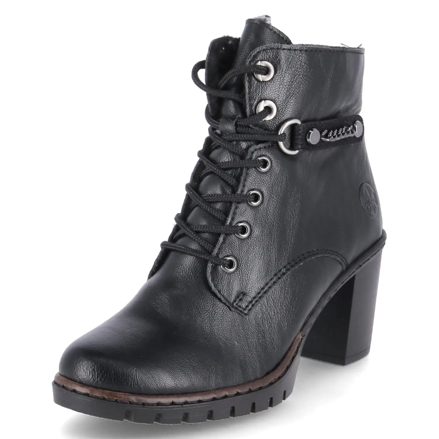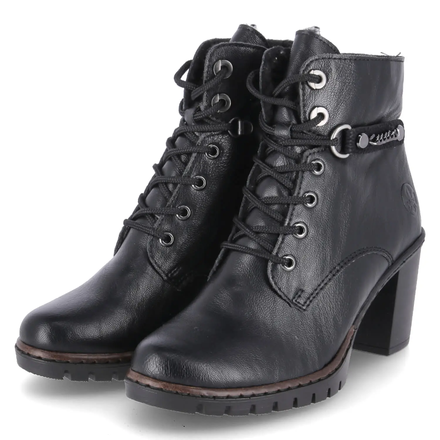 Rieker Damen Winter-Stiefeletten/ Ankle Boots Schwarz Kunstleder – geringes Gewicht – Zierriemen mit Kettenelement – Reißverschluss und Schnürung – warmes Textilfutter – robuste Profillaufsohle