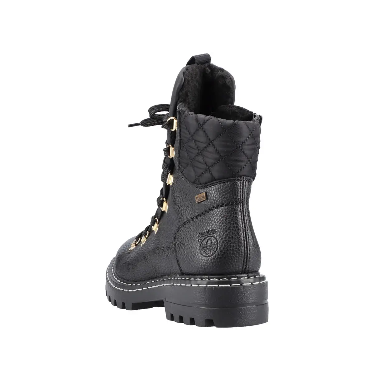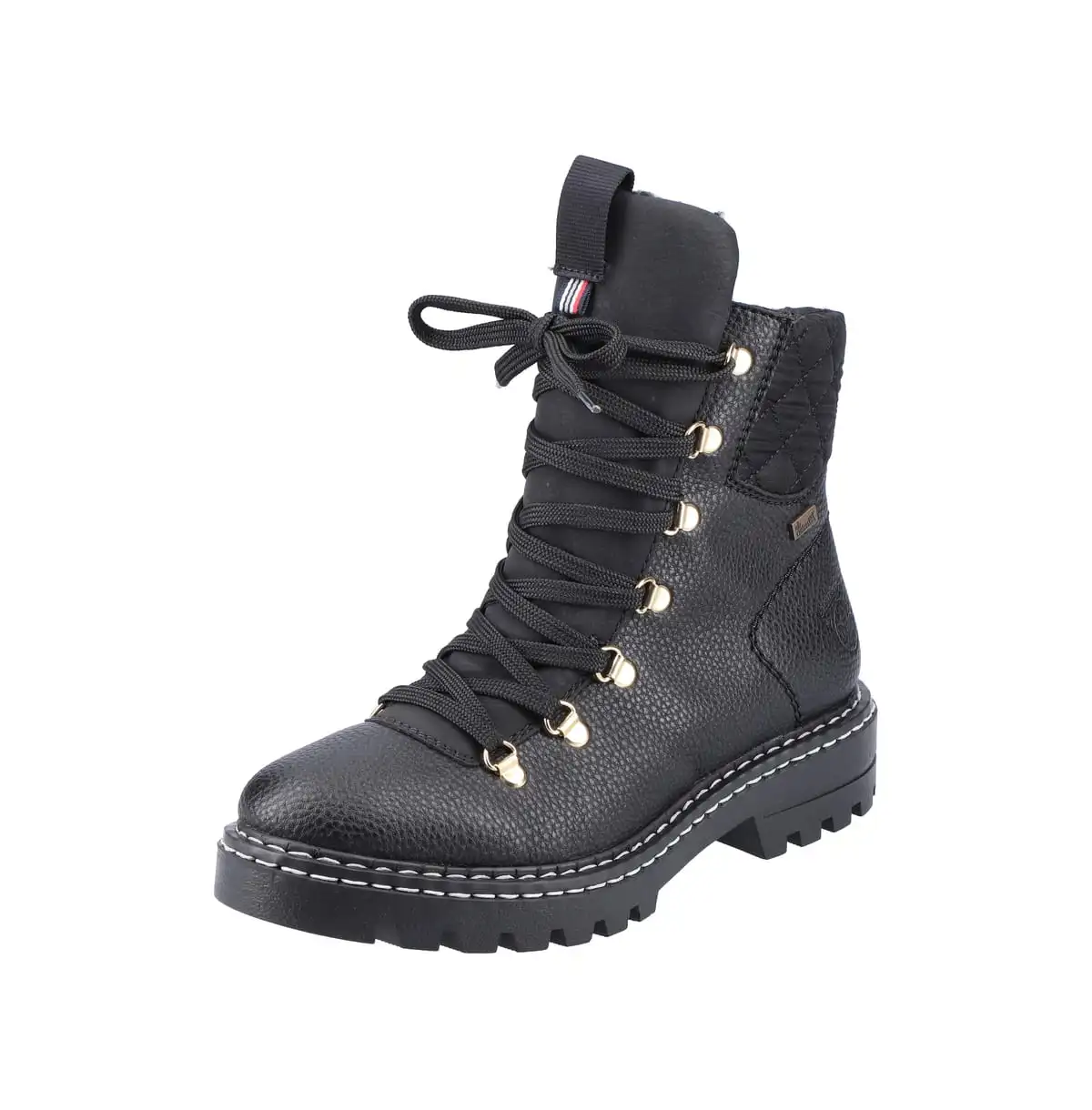 Rebellisch cool und total angesagt. Diese lässigen Biker Boots mit gestepptem, mittelhohem Schaft kann man sowohl im Alltag als auch in der Freizeit zu vielen Looks kombinieren! Die clevere Kombination aus Schnürung und Reißverschluss ermöglicht ein einfaches An- und Ausziehen. Goldfarbene Bergsteigerösen sind hübsche Details. Die leichte und robuste Profilsohle überzeugt auf ganzer Linie und die weiche Decksohle sorgt für extra Tragekomfort. Außerdem ist deinen Füßen durch die Komfortweite G mehr Raum geboten. Die kuschelige Fütterung und die RiekerTex-Technologie halten die Füße warm und trocken.