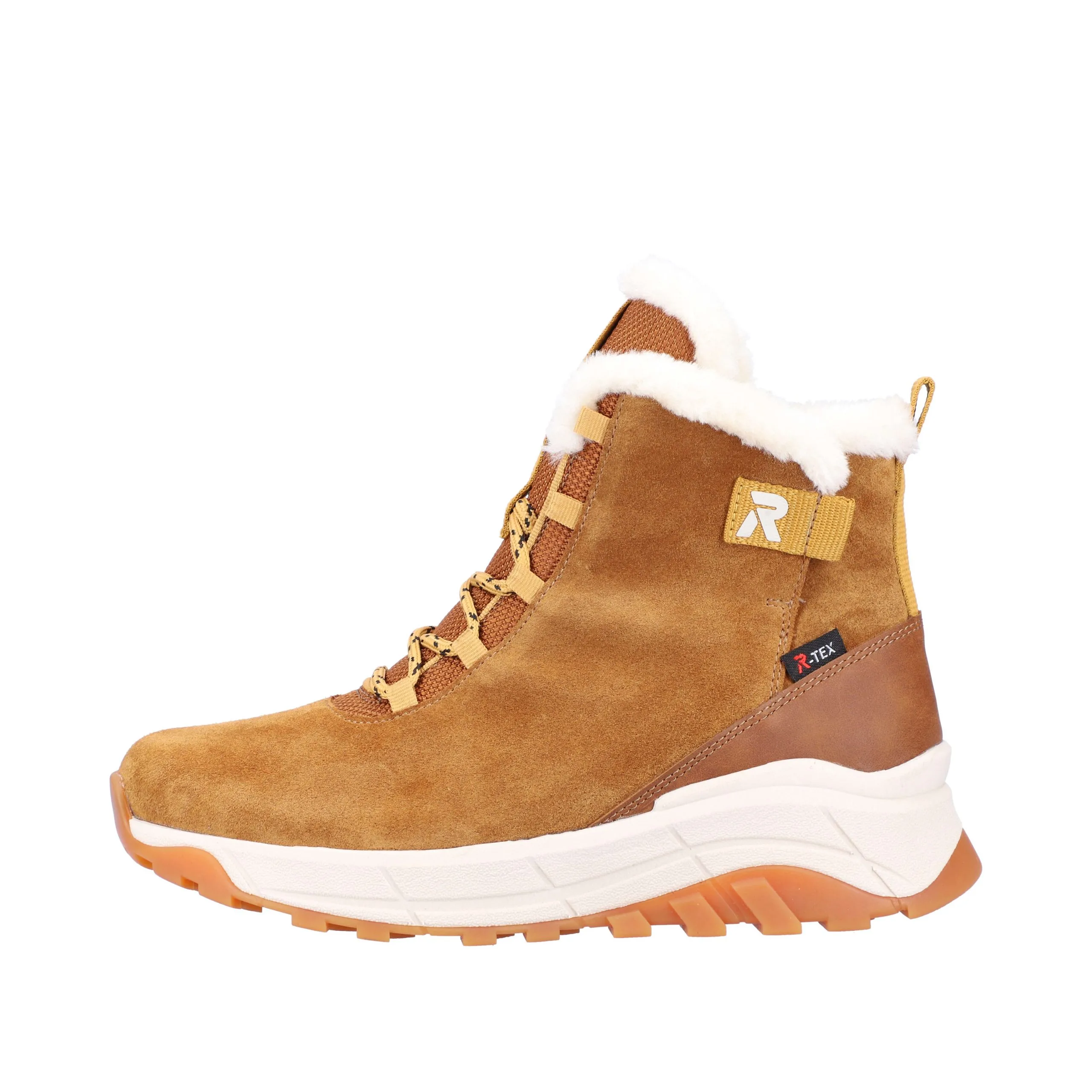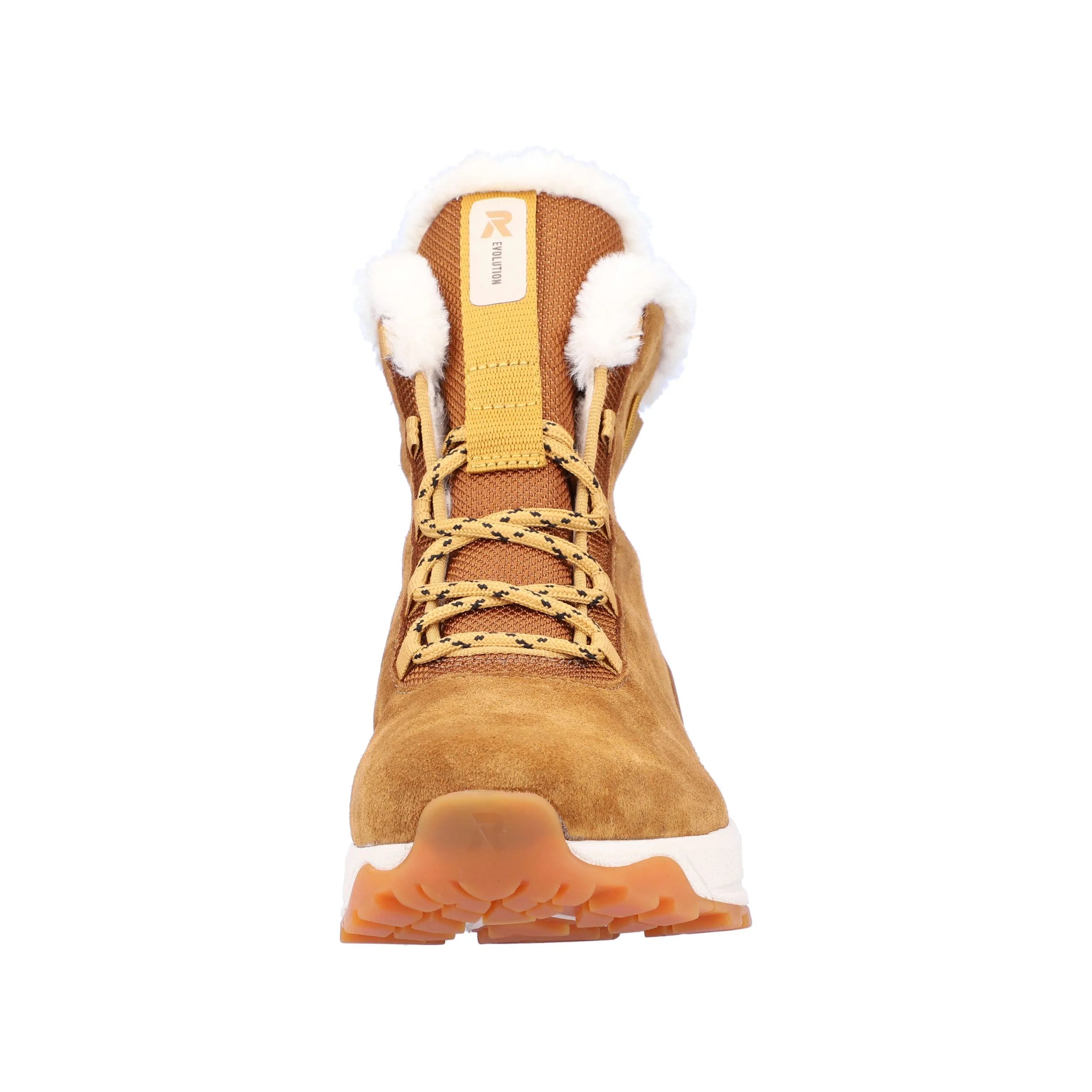 Alle Damen mit kalten Füßen aufgepasst: Mit diesen kuschelig-gefütterten Stiefeln von Rieker EVOLUTION aus hellbraunem Rauleder gehören kalte Füße der Vergangenheit an! Die dicke, weisse Laufsohle des Schnürers ist superleicht! Die softe Einlegesohle mit Kälteblocker lässt sich ganz leicht herausnehmen. Schmutz und Wasser können diesen Stiefeln gar nichts! Die clevere TEX-Membran plus Nano-Beschichtung sind ein unschlagbares Schutzschild!