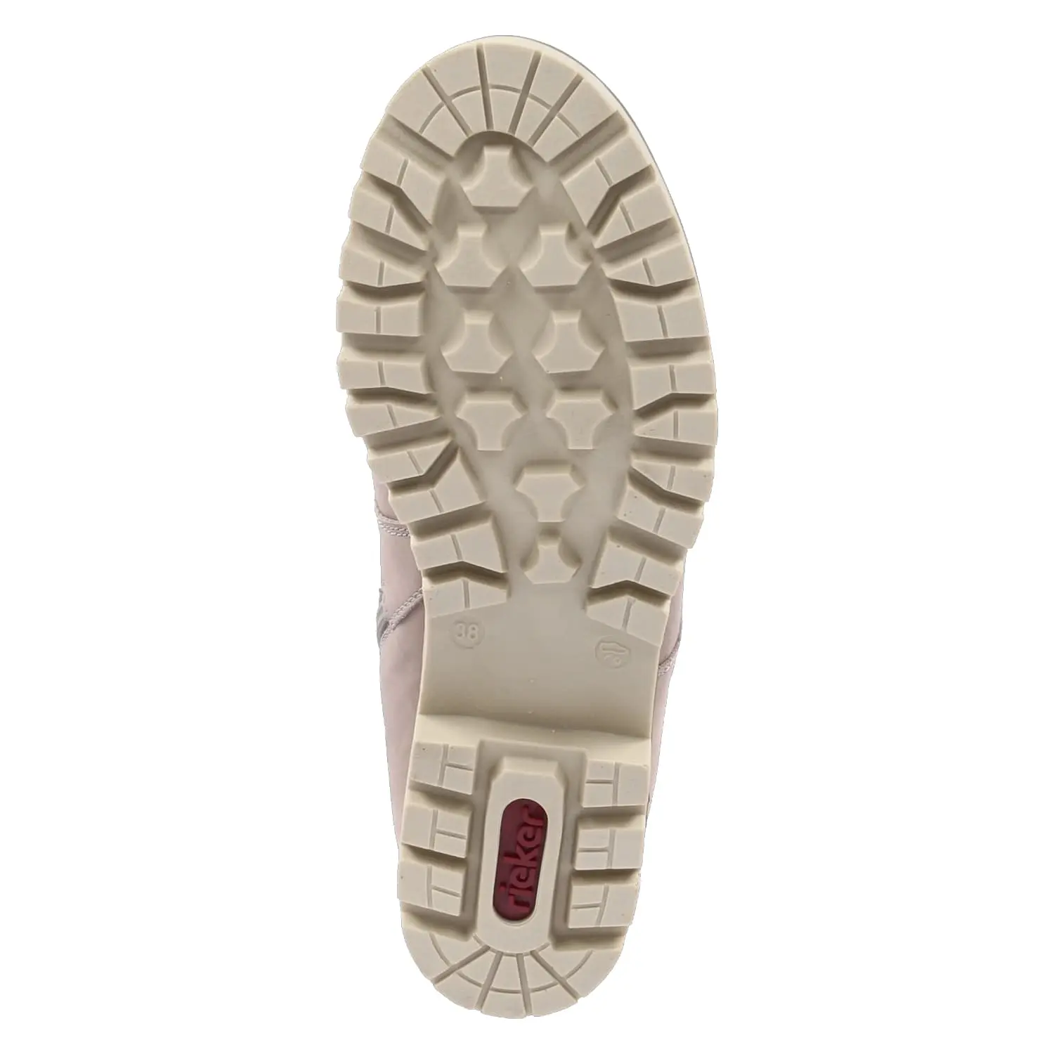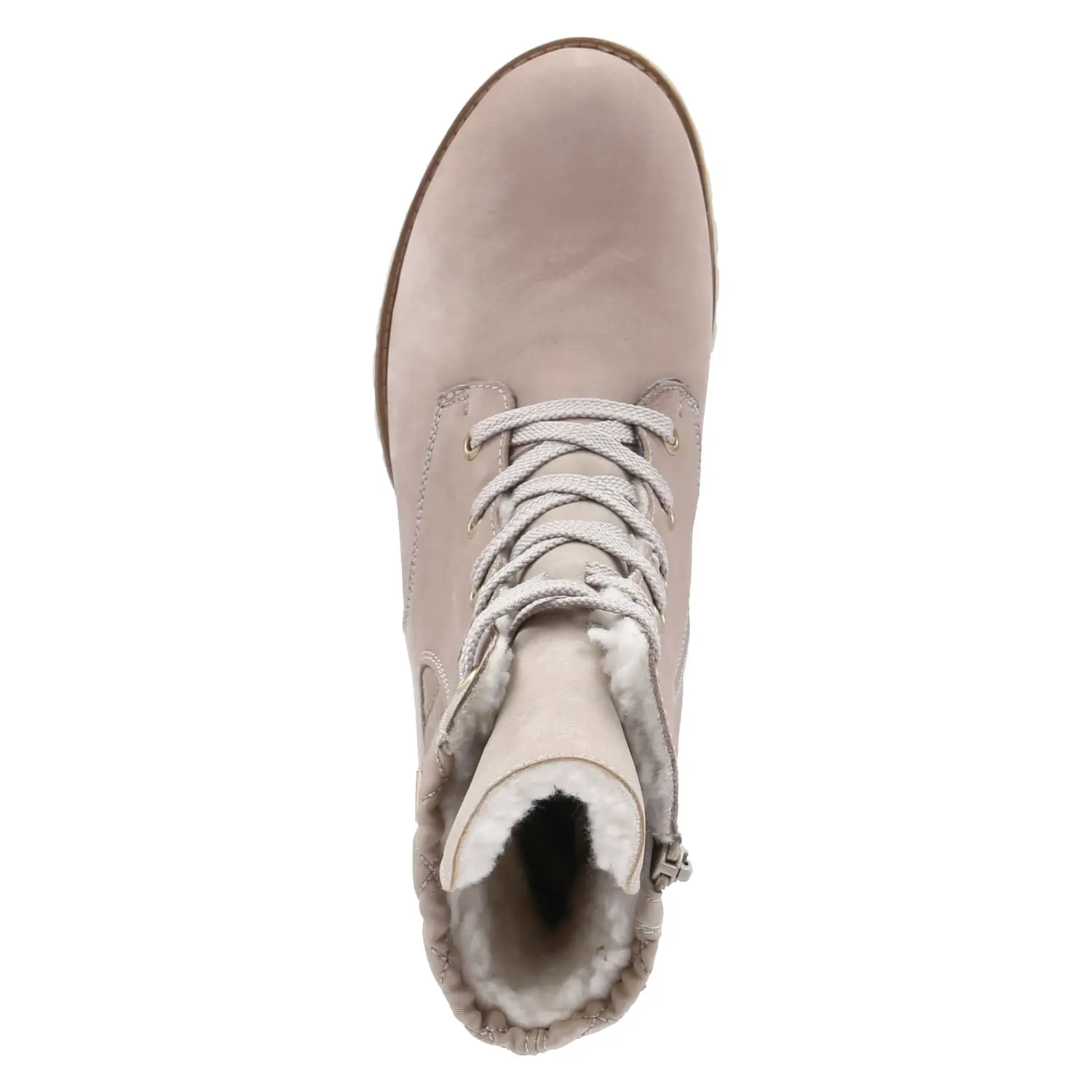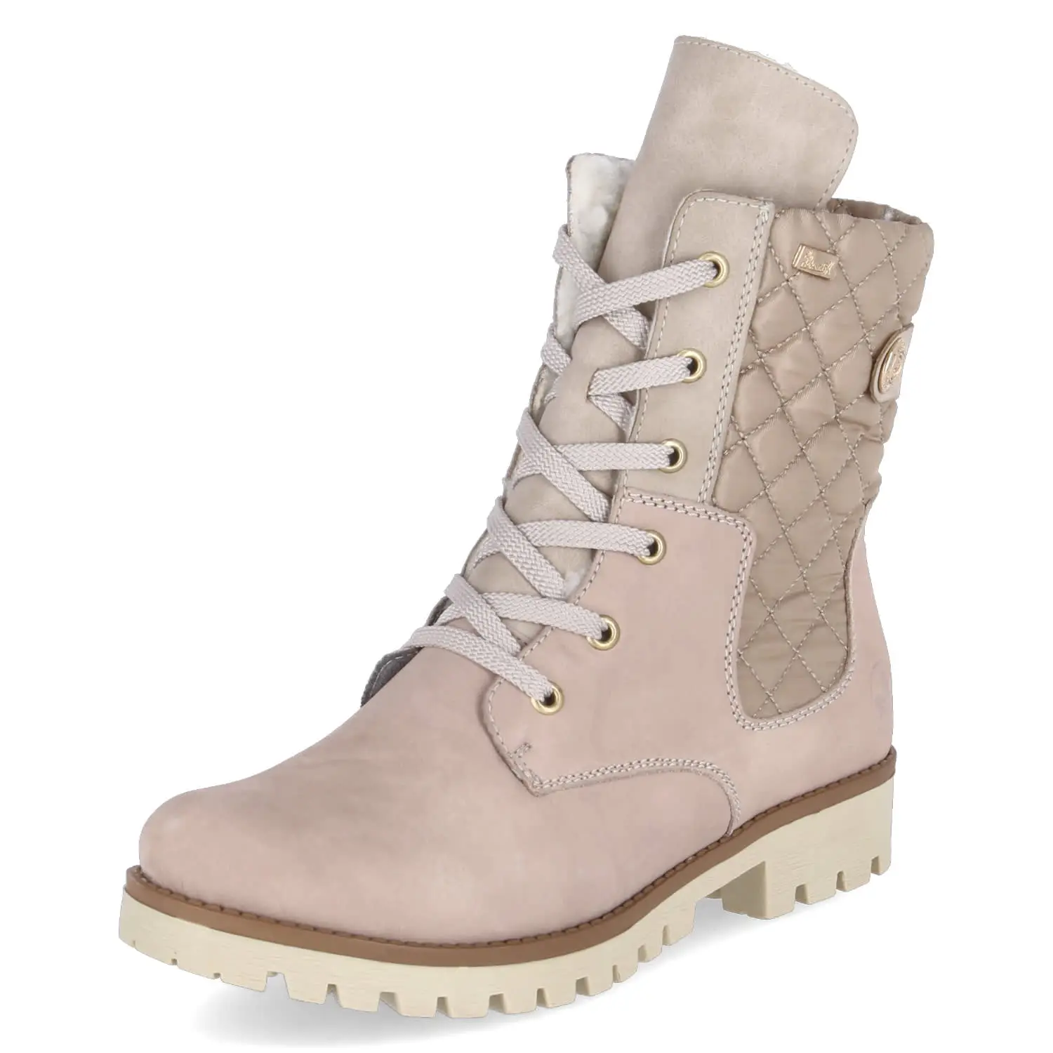 Rieker Damen Schnürboots/ Winter-Stiefeletten Beige Textil-Synthetik-Mix – Farbe kann, je nach Beleuchtung Rosa wirken – wasserfest, atmungsaktiv – Schnürung und Reißverschluss – weicher Schaft mit Karosteppung und Zierriemen – verstärkte Ferse – rutschhemmende Profilsohle – warmes Teddyfutter