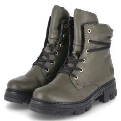 Rieker Damen Schnür-Stiefeletten/ Winter Boots Grün Kunstleder – Reißverschluss und Schnürung – hinten geraffter Schaft – gepolsterte Decksohle – starke, rutschhemmende Profilsohle – warmes Teddyfutter