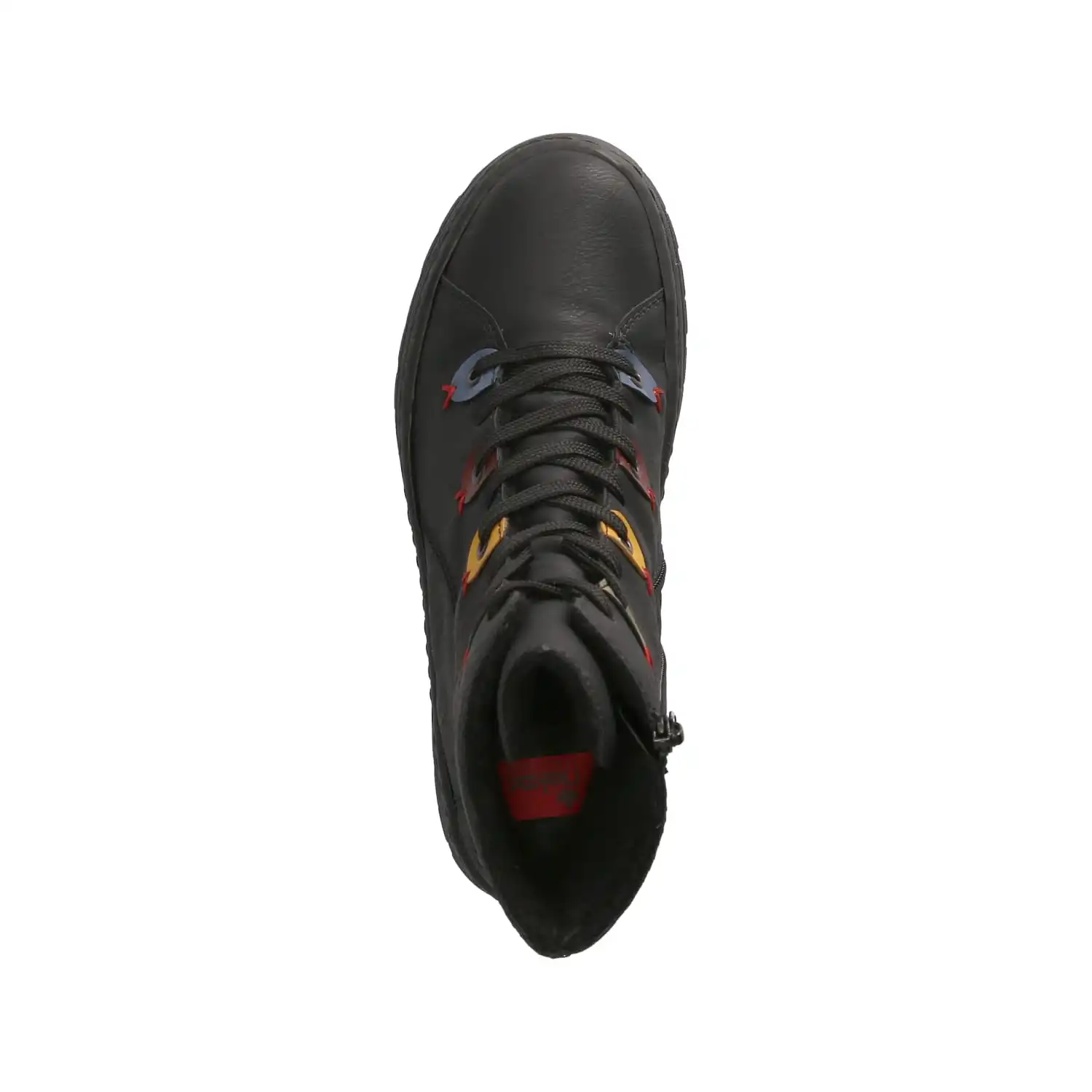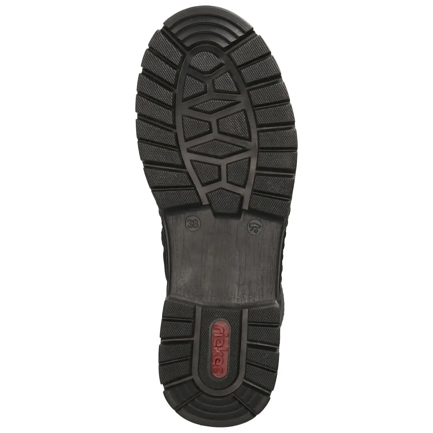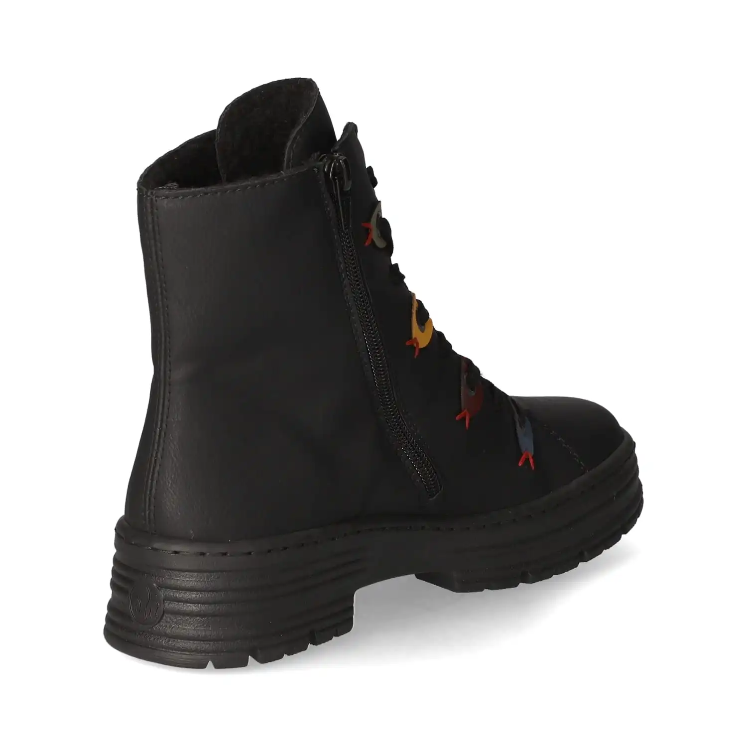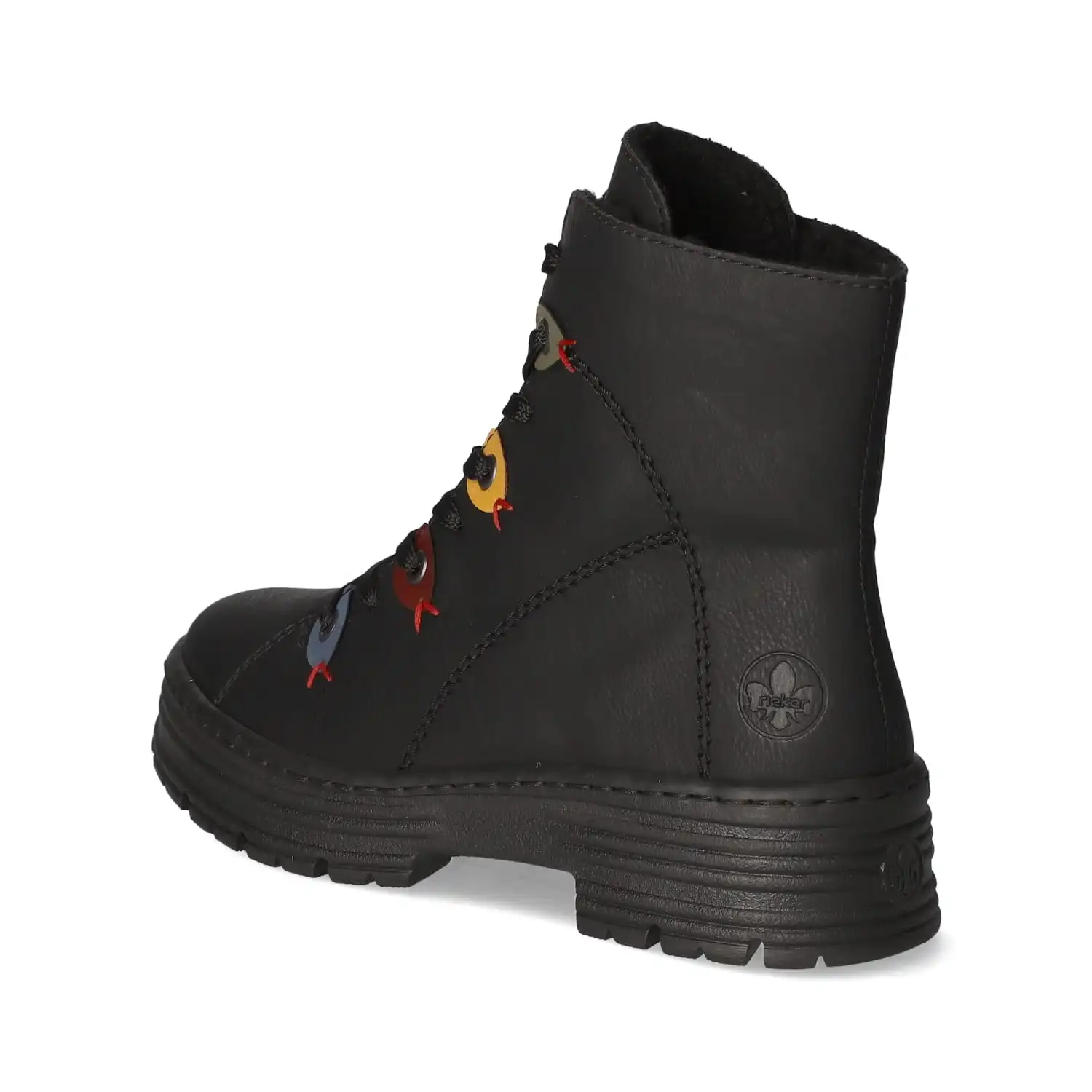 Rieker Damen Stiefeletten/ Schnürstiefeletten Schwarz Synthetik – Schnürung und Reißverschluss – kleine bunte Details an der Schnürung – Warmfutter – gepolstertes Wechselfußbett – flexible, rutschhemmende Laufsohle mit Profil – ca. 5 cm Blockabsatz