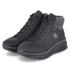 Rieker Damen Schnürboots/ Winter-Stiefeletten Schwarz Kunstleder – wasserfest, atmungsaktiv – sportlicher Schnitt – geringes Gewicht – Schnürung und Reißverschluss – gepolsterter Einstieg mit Filz – gepolstertes Wechselfußbett – warmes Textilfutter – flexible und rutschhemmende Laufsohle – verstärkter Zehen- und Fersenbereich