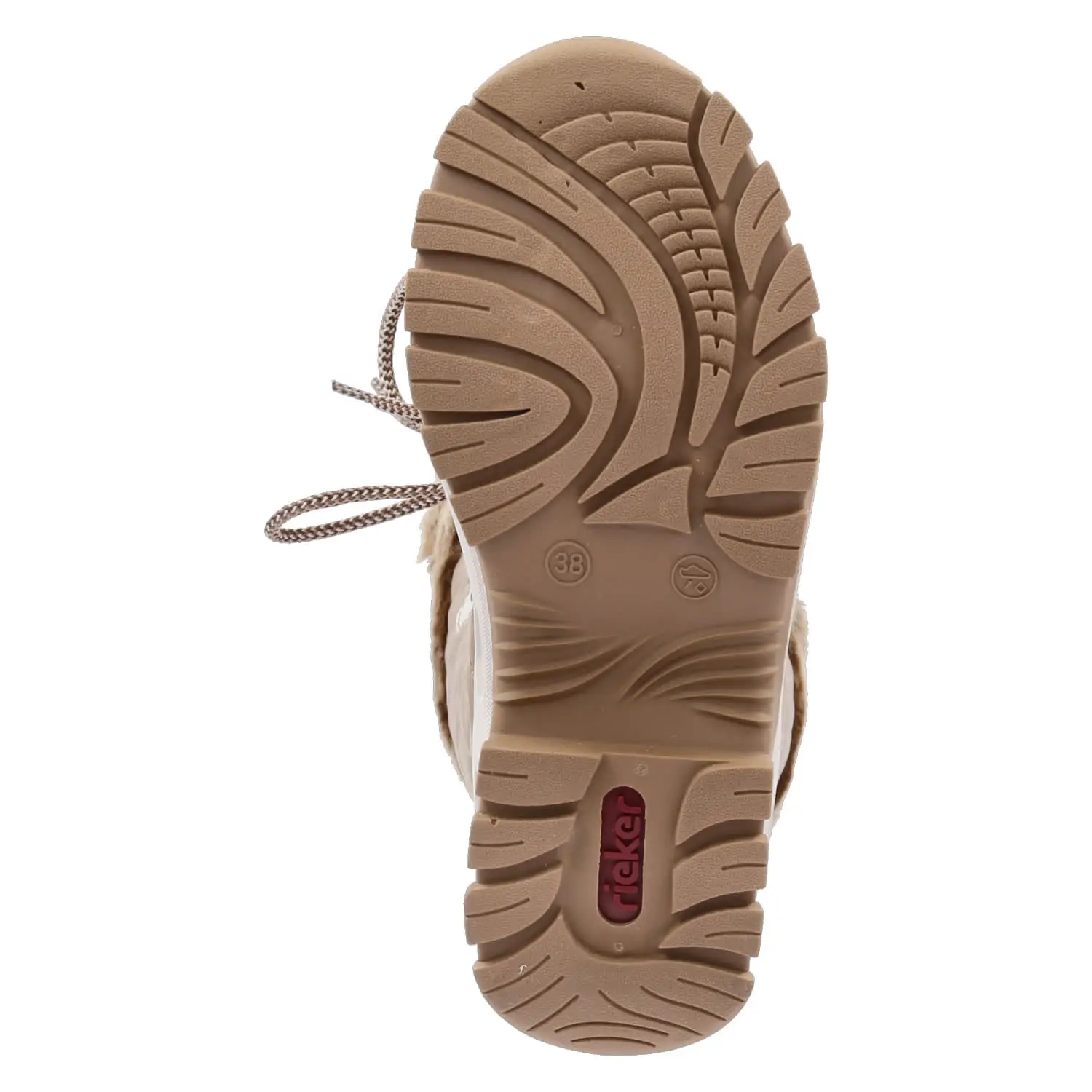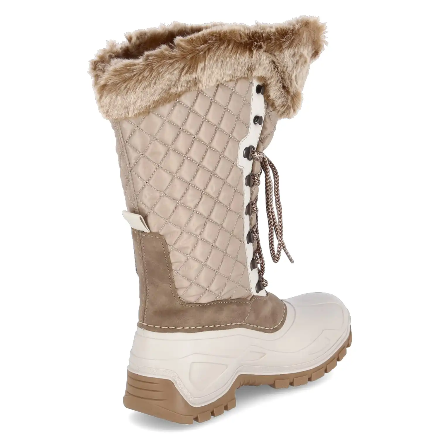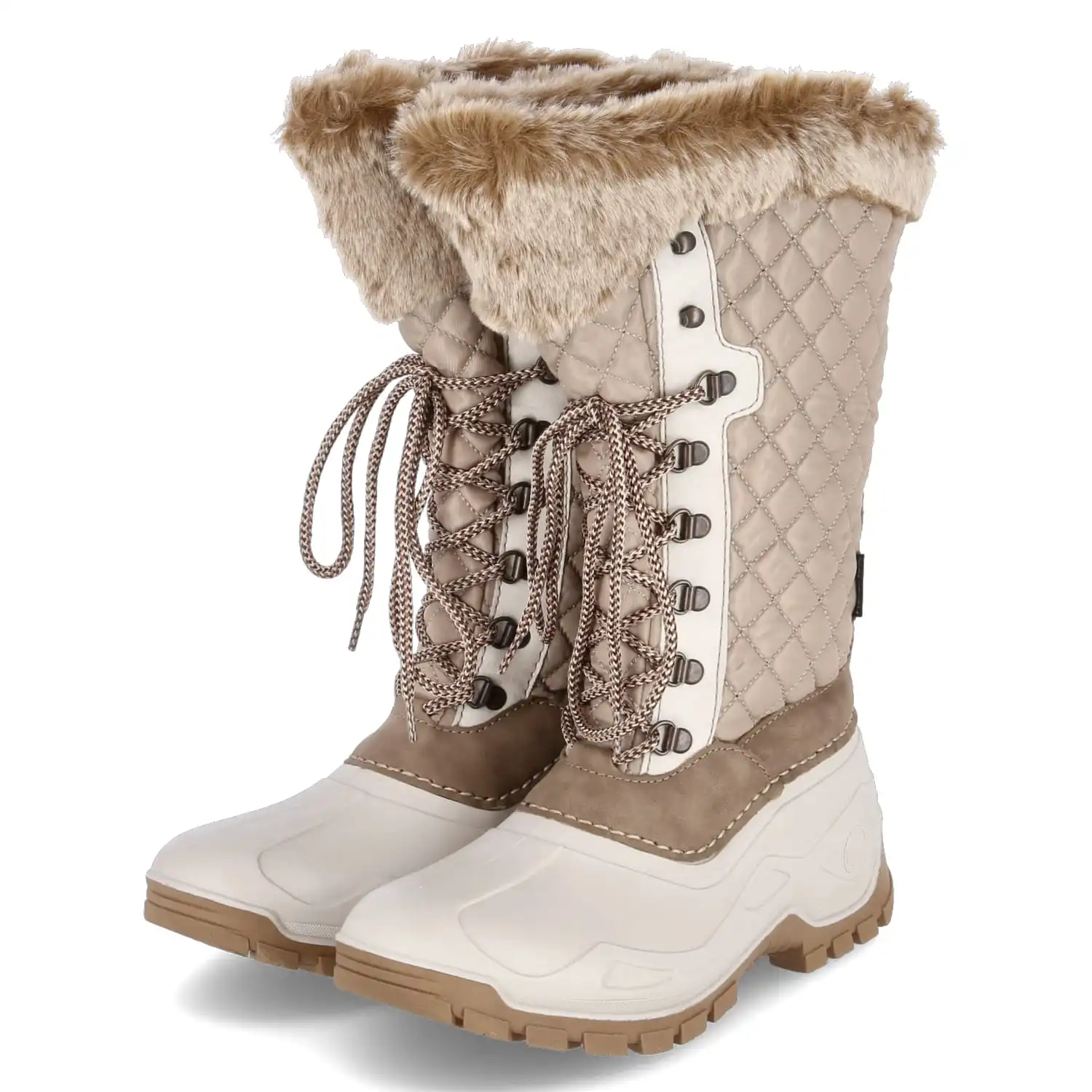 Rieker Damen Winter-Stiefel Beige Textil-Synthetik-Mix – weicher, weiter Schaft mit Rautensteppung, Kunstfellkragen und Schnürung – wasserfest, isolierend, atmungsaktiv – warmes Futter – gepolsterte Decksohle – flexible und rutschhemmende Laufsohle